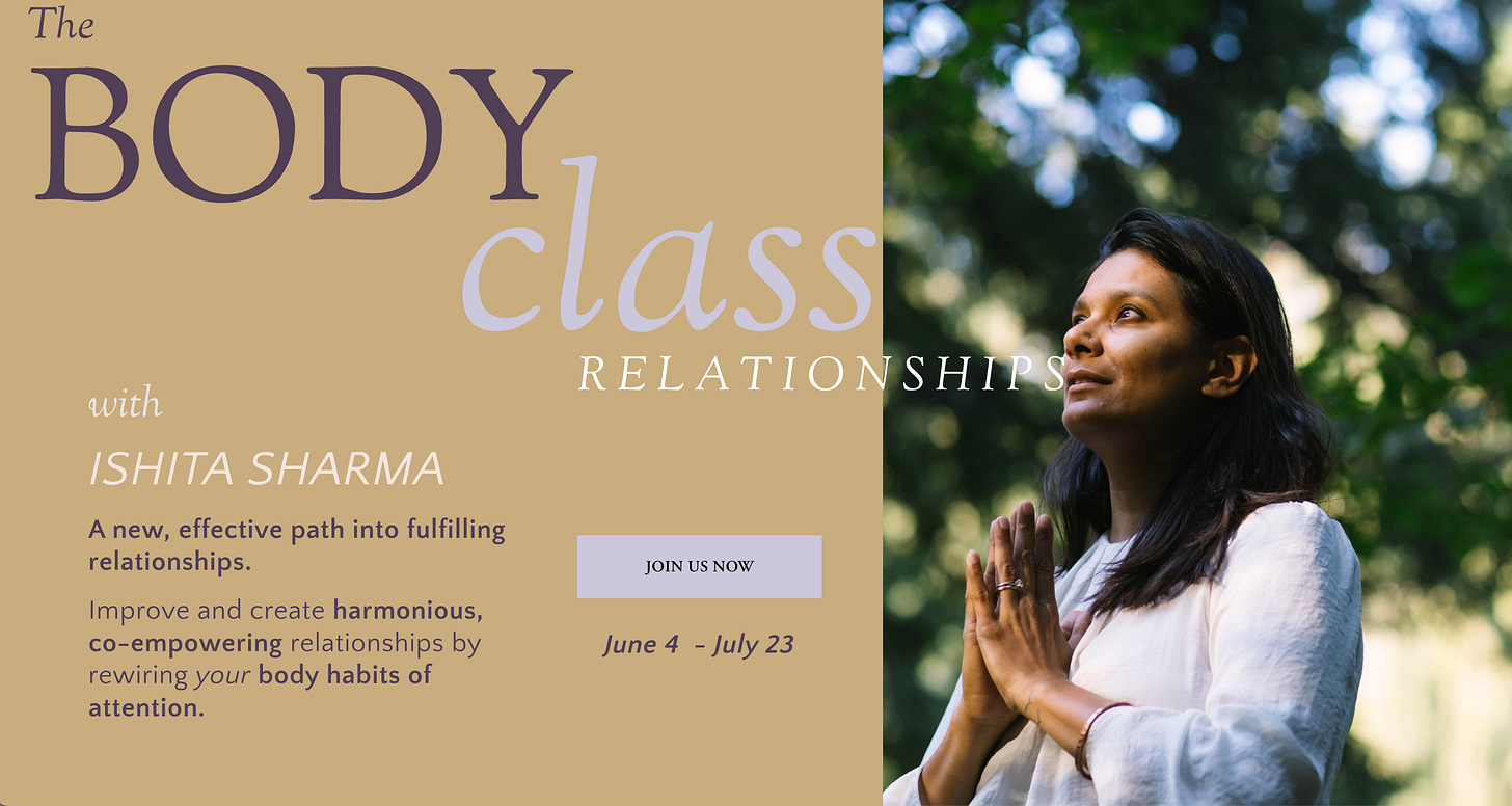 In THE BODY CLASS on Relationships- an 8-week online course, we will examine how to bring your embodied presence into all your relationships.